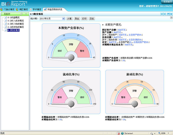 對于平均住院日及病床使用率等關(guān)鍵指標(biāo),我們通過儀表盤的方式進行展現(xiàn),通過與目標(biāo)值的比較得出關(guān)鍵指標(biāo)是否達標(biāo),并通過儀表盤上指針的指向能夠快速獲得關(guān)鍵指標(biāo)的達標(biāo)信息。