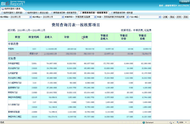 對于收入的統(tǒng)計,主要從科室角度進行,如分科室統(tǒng)計收入情況,統(tǒng)計收入結(jié)構(gòu)情況,并將科室收入按照開單、執(zhí)行、計價、實收等數(shù)據(jù)進行統(tǒng)計。