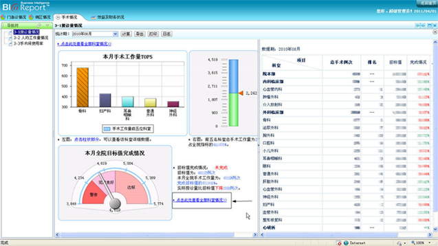 對于手工工作量我們通過按照科室進行排名,并將全院手術(shù)目標(biāo)完成情況通過儀表盤的方式進行展現(xiàn),通過指針指向能夠快速了解手術(shù)指標(biāo)完成情況。
