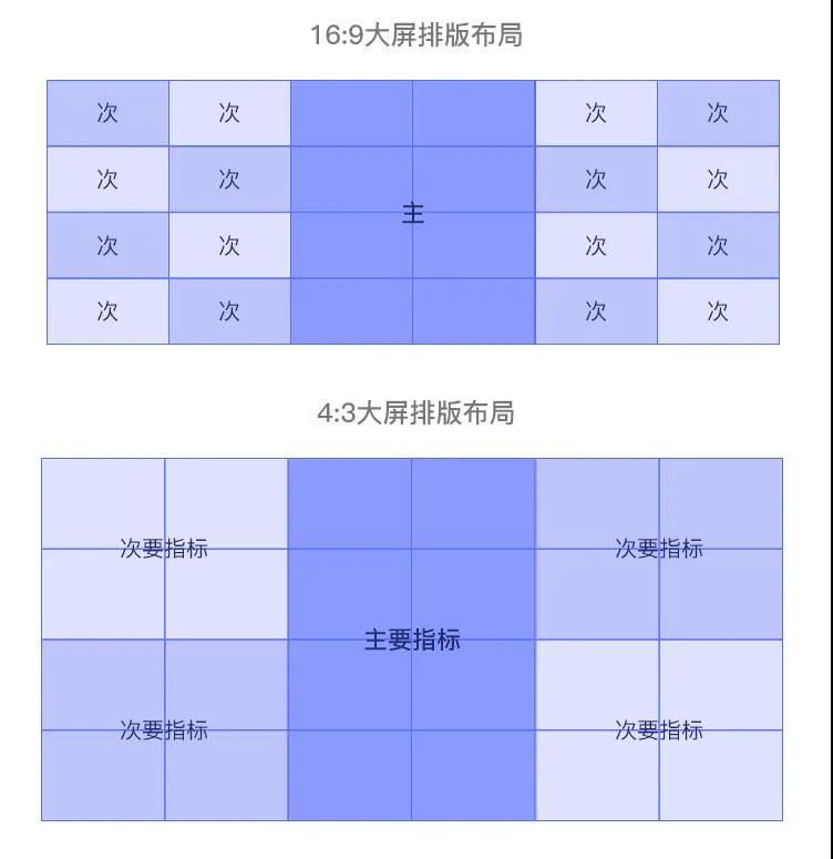 大屏可視化由于承載體的特殊性,有時(shí)候一個(gè)小小的差錯(cuò)會(huì)使得效果千差萬別,如果客戶是4:3的屏,你大筆一揮設(shè)計(jì)成16:9的,那個(gè)壓縮效果不忍直視,怕是需求方要追著你打。所以做好前期調(diào)研很重要,包括大屏比例、材質(zhì),在哪里演示,對(duì)何人演示,有什么目的等。 下圖是不同比例大屏的分布策略,可供參考: